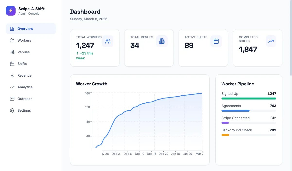 A purpose-built admin console tracking every stage of the marketplace in real time — worker growth, full pipeline from signup through background check, active shifts, venue management, revenue, and outreach. One screen. Total visibility.